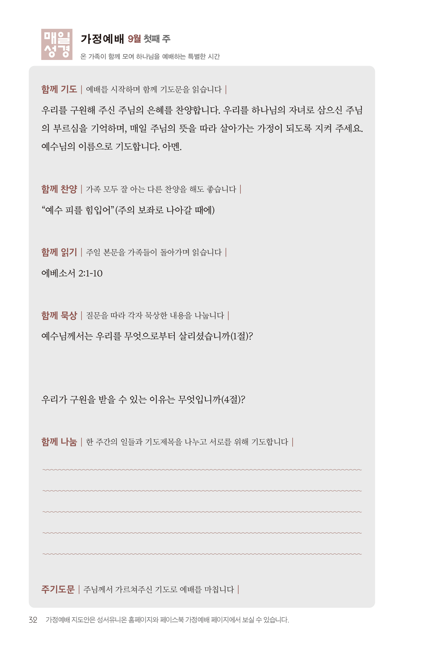 2) 순서지의 내용을 따라 가정예배를 드립니다.
