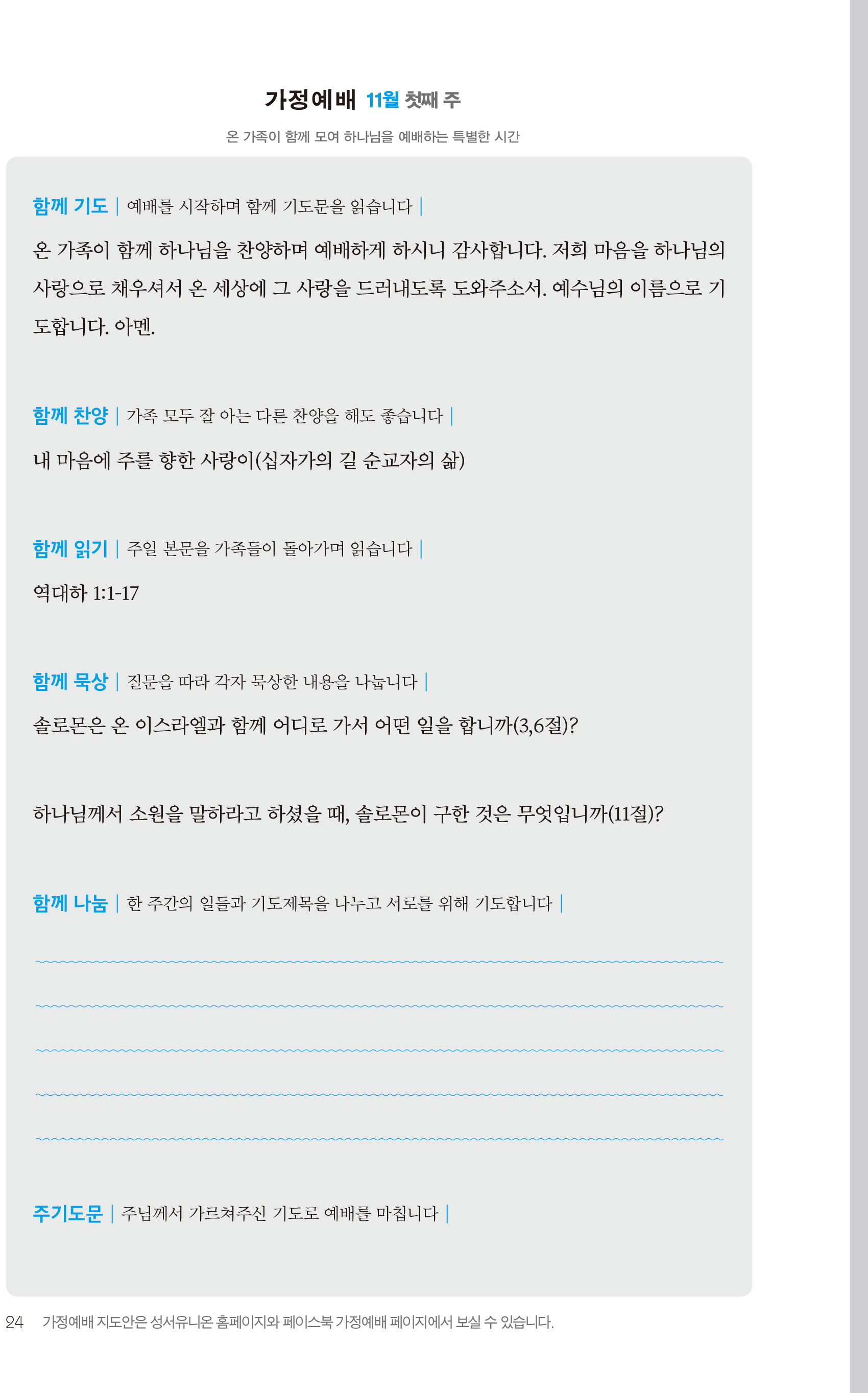 1) 교회홈페이지에서 매일성경 가정예배지를 다운받아 순서지를 준비합니다.