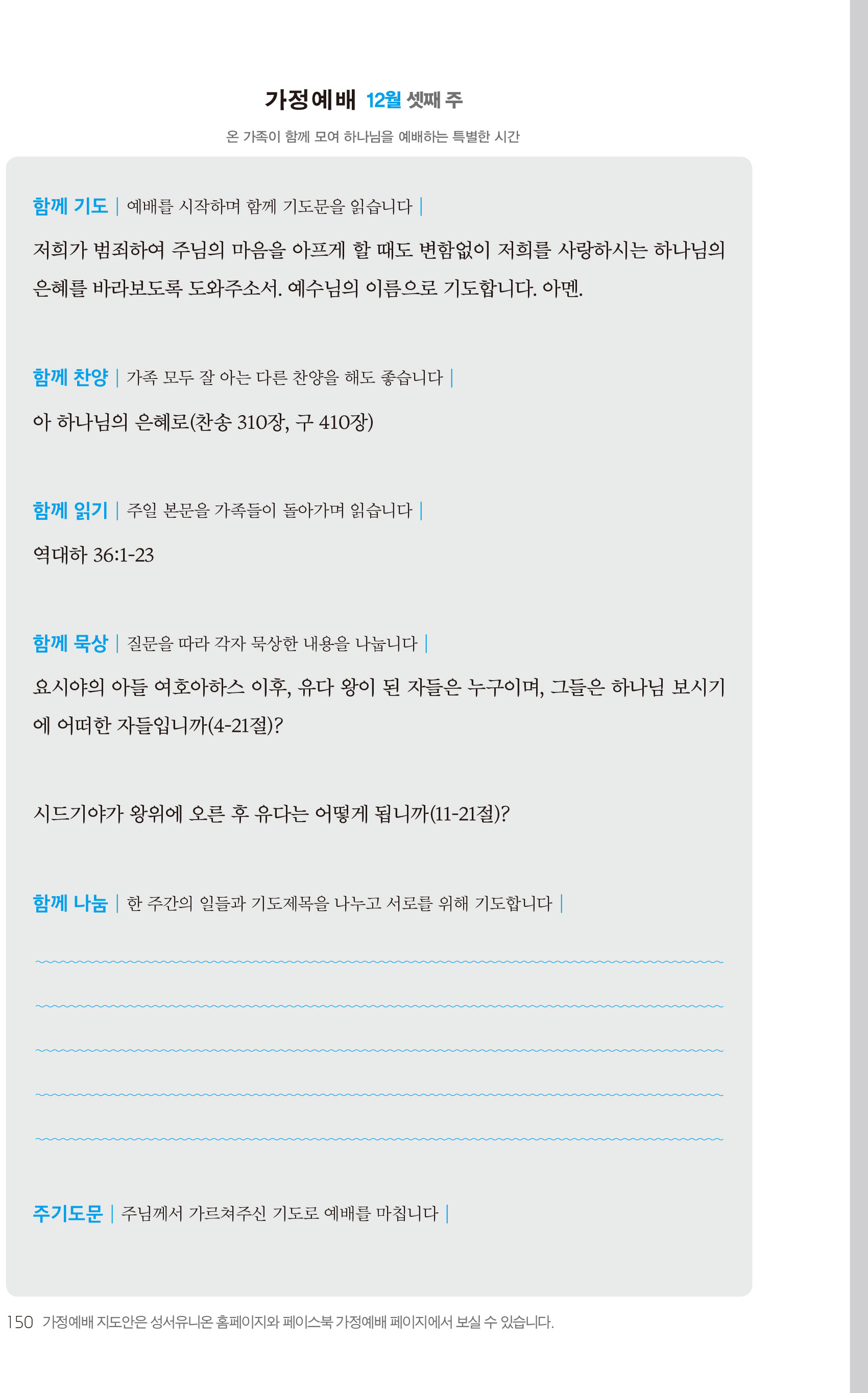2) 순서지의 내용을 따라 가정예배를 드립니다.