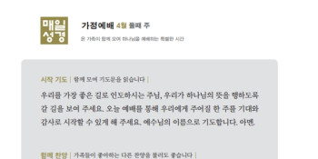 매일성경이용_주일가정예배 (2026년 4월 12일)1) 교회홈페이지에서 매일성경 가정예배지를 다운받아 순서지를 준비합니다.2) 순서지의 내용을 따라 가정예배를 드립니다.3) 함께 묵상할 내용을 서로 질문하고 묵상한 내용을 함께 나눕니다.4) 한 주간의 일들의 기도제목을 나누고 서로를 위해 함께 기도합니다.<매일성경 가정예배 가이드>1. 가정예배는…