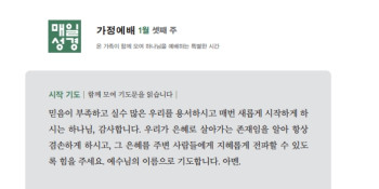 매일성경이용_주일가정예배 (2026년 1월 18일)1) 교회홈페이지에서 매일성경 가정예배지를 다운받아 순서지를 준비합니다.2) 순서지의 내용을 따라 가정예배를 드립니다.3) 함께 묵상할 내용을 서로 질문하고 묵상한 내용을 함께 나눕니다.4) 한 주간의 일들의 기도제목을 나누고 서로를 위해 함께 기도합니다.<매일성경 가정예배 가이드>1. 가정예배는…