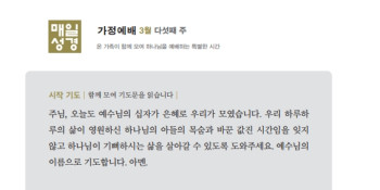 매일성경이용_주일가정예배 (2026년 3월 29일)1) 교회홈페이지에서 매일성경 가정예배지를 다운받아 순서지를 준비합니다.2) 순서지의 내용을 따라 가정예배를 드립니다.3) 함께 묵상할 내용을 서로 질문하고 묵상한 내용을 함께 나눕니다.4) 한 주간의 일들의 기도제목을 나누고 서로를 위해 함께 기도합니다.<매일성경 가정예배 가이드>1. 가정예배는…