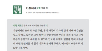 매일성경이용_주일가정예배 (2026년 2월 22일)1) 교회홈페이지에서 매일성경 가정예배지를 다운받아 순서지를 준비합니다.2) 순서지의 내용을 따라 가정예배를 드립니다.3) 함께 묵상할 내용을 서로 질문하고 묵상한 내용을 함께 나눕니다.4) 한 주간의 일들의 기도제목을 나누고 서로를 위해 함께 기도합니다.<매일성경 가정예배 가이드>1. 가정예배는…