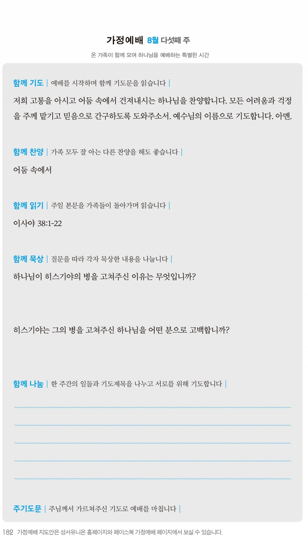 2) 순서지의 내용을 따라 가정예배를 드립니다.