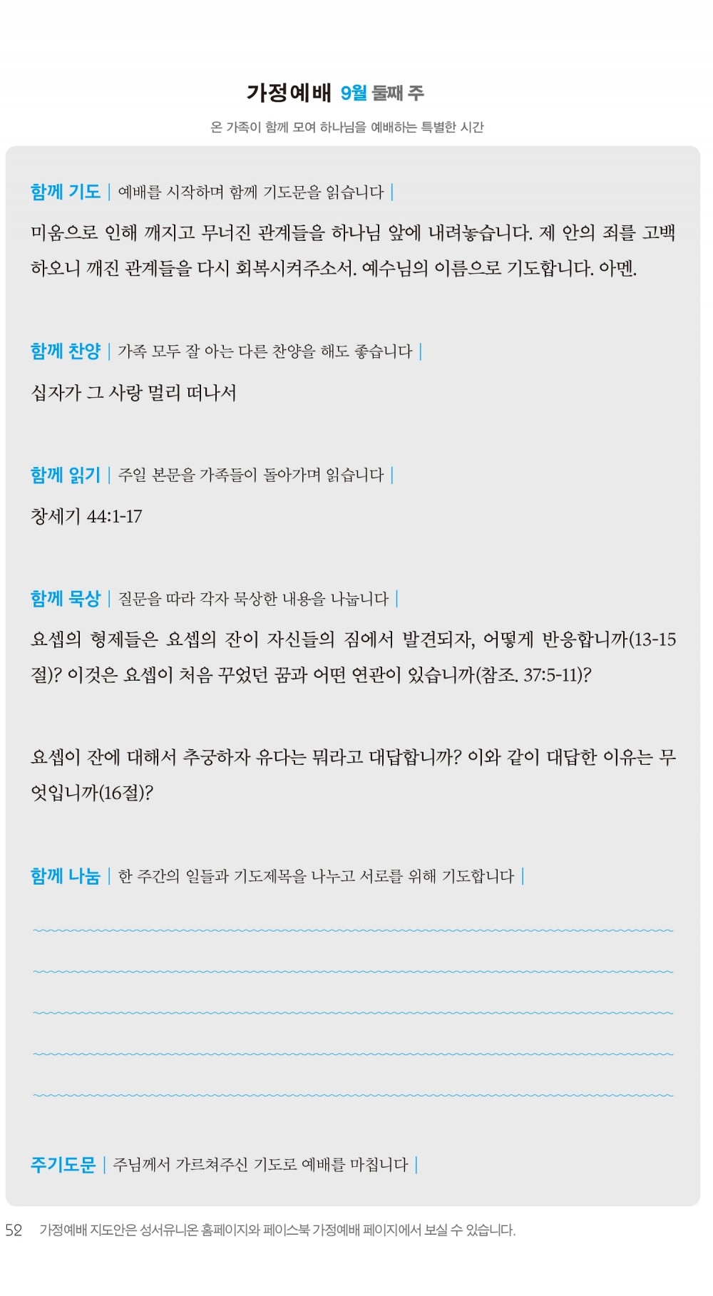2) 순서지의 내용을 따라 가정예배를 드립니다.