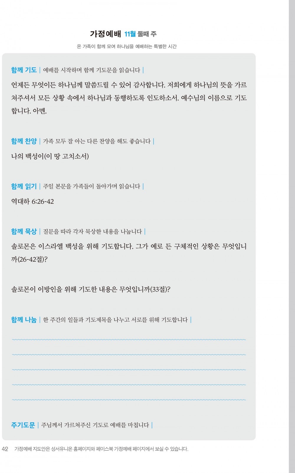 2) 순서지의 내용을 따라 가정예배를 드립니다.