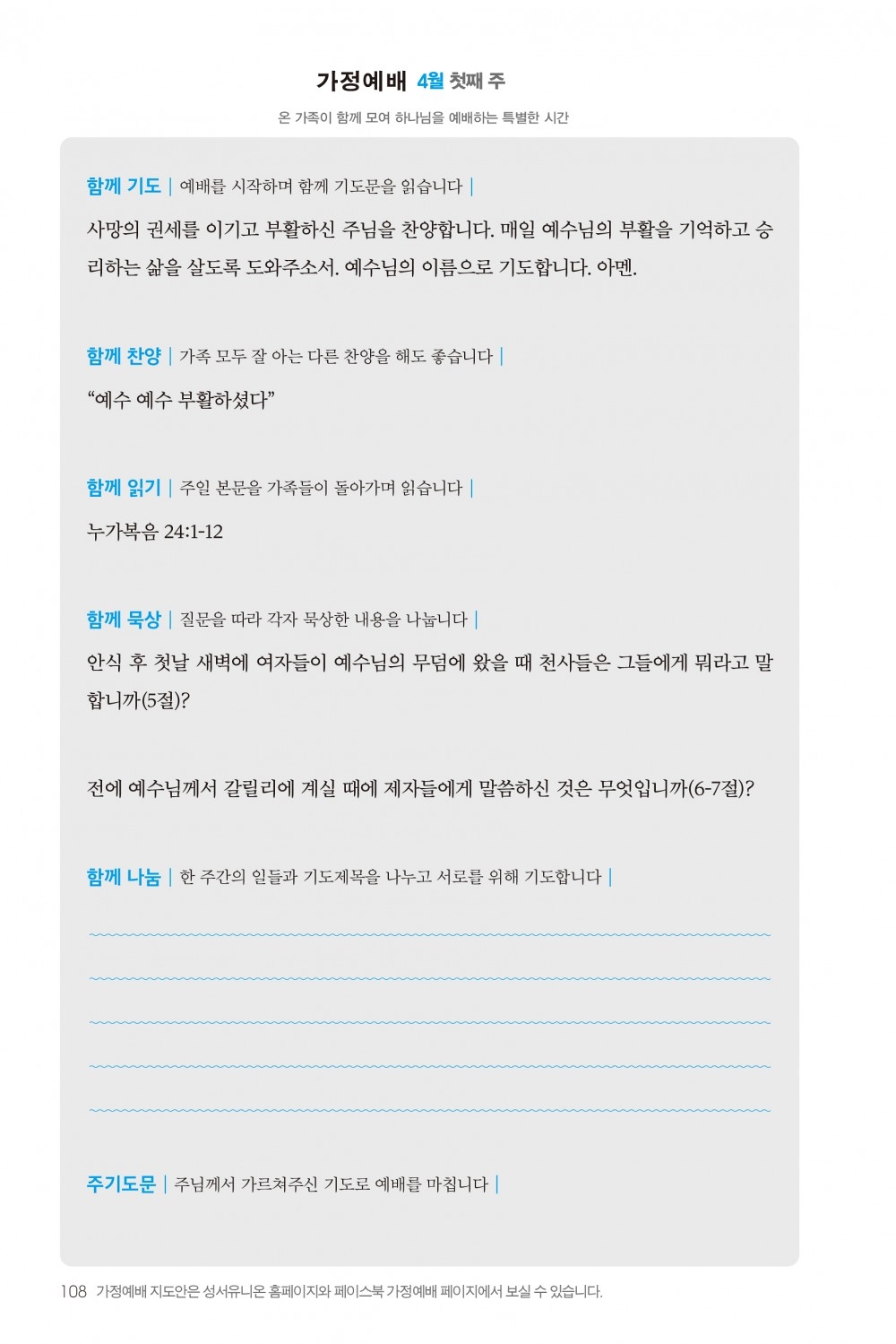 2) 순서지의 내용을 따라 가정예배를 드립니다.