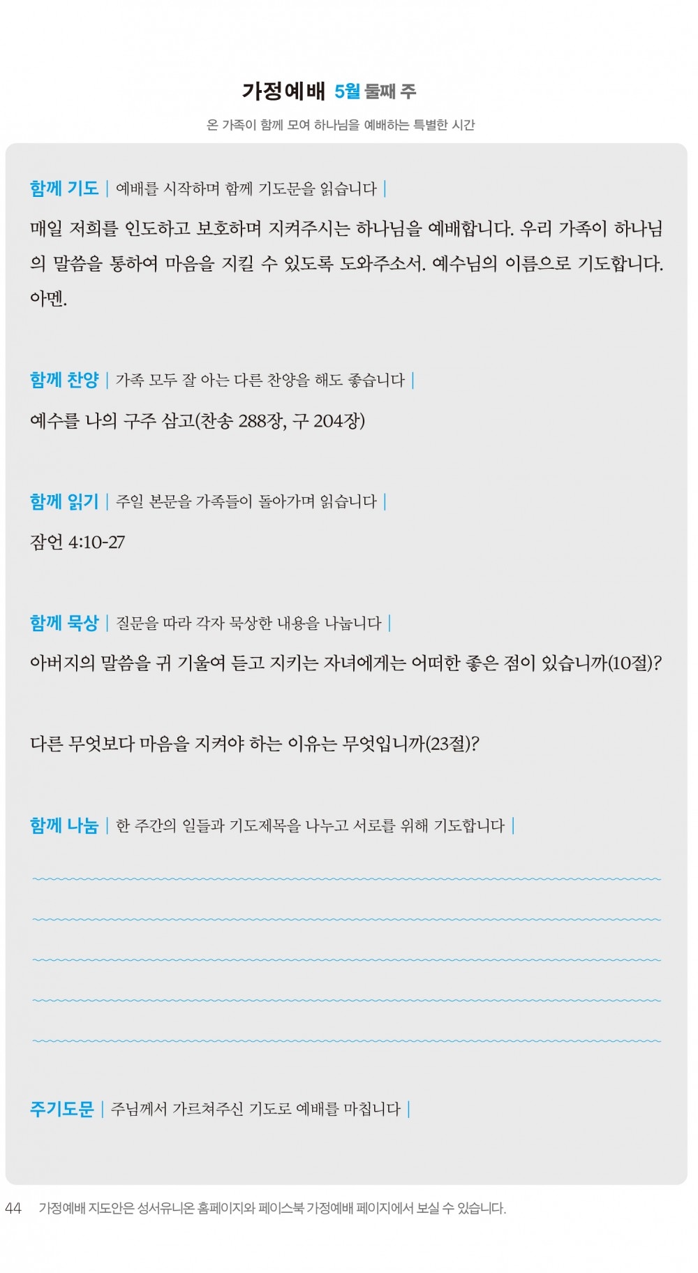 2) 순서지의 내용을 따라 가정예배를 드립니다.