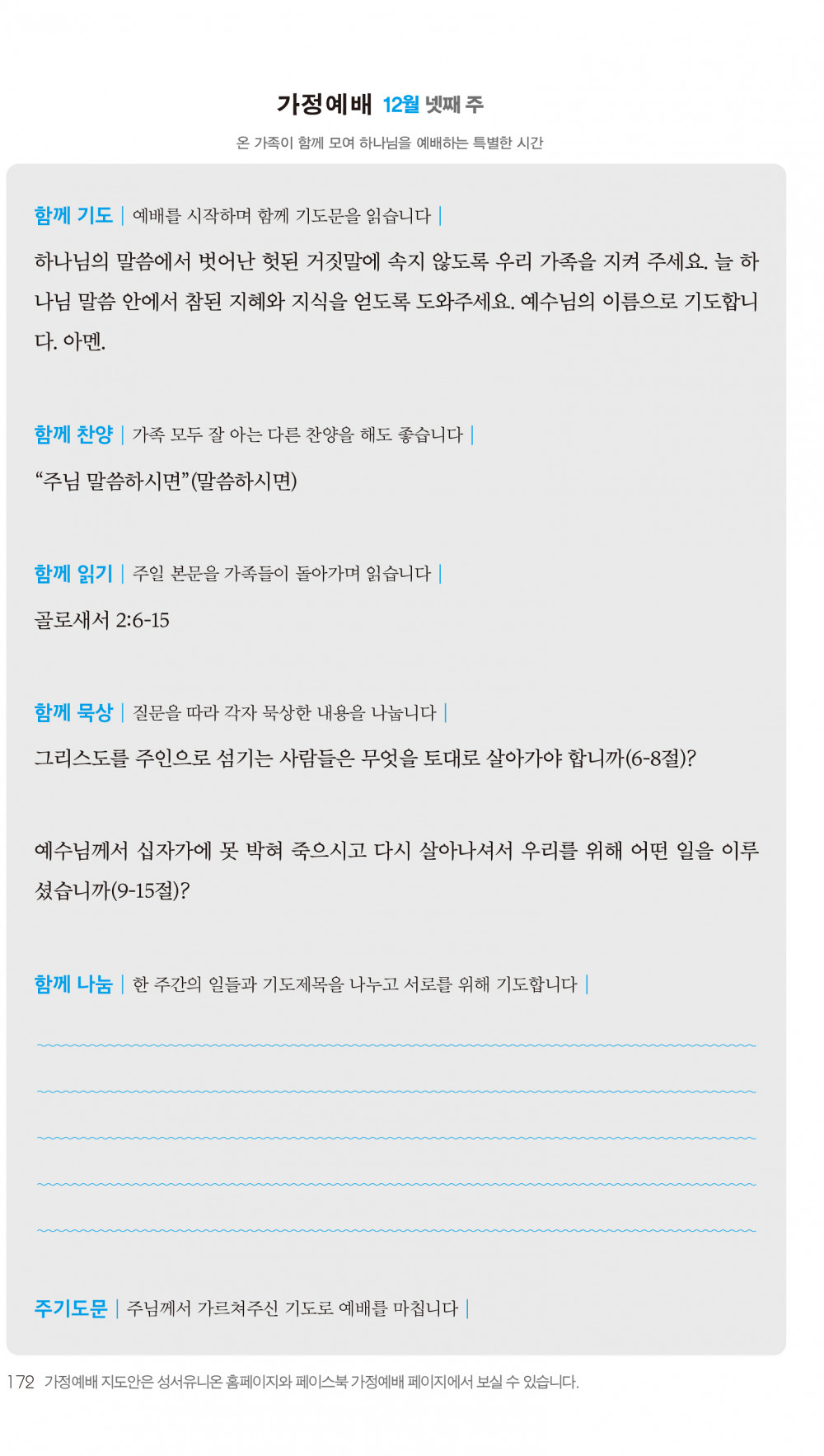2) 순서지의 내용을 따라 가정예배를 드립니다.