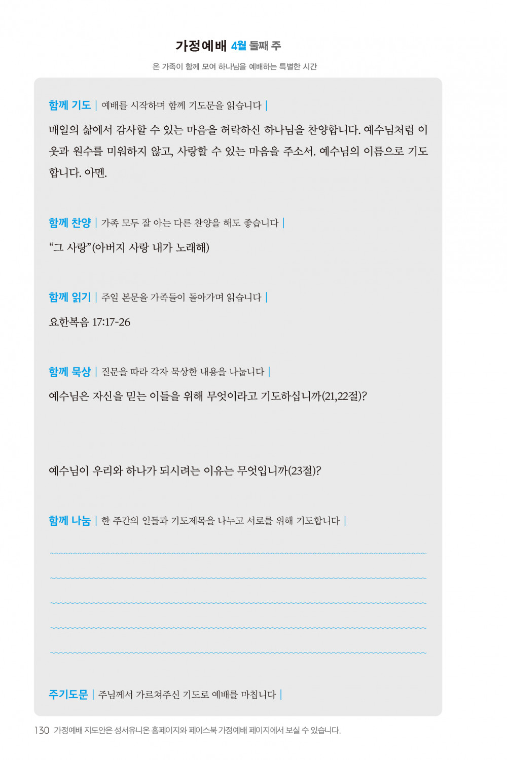 2) 순서지의 내용을 따라 가정예배를 드립니다.