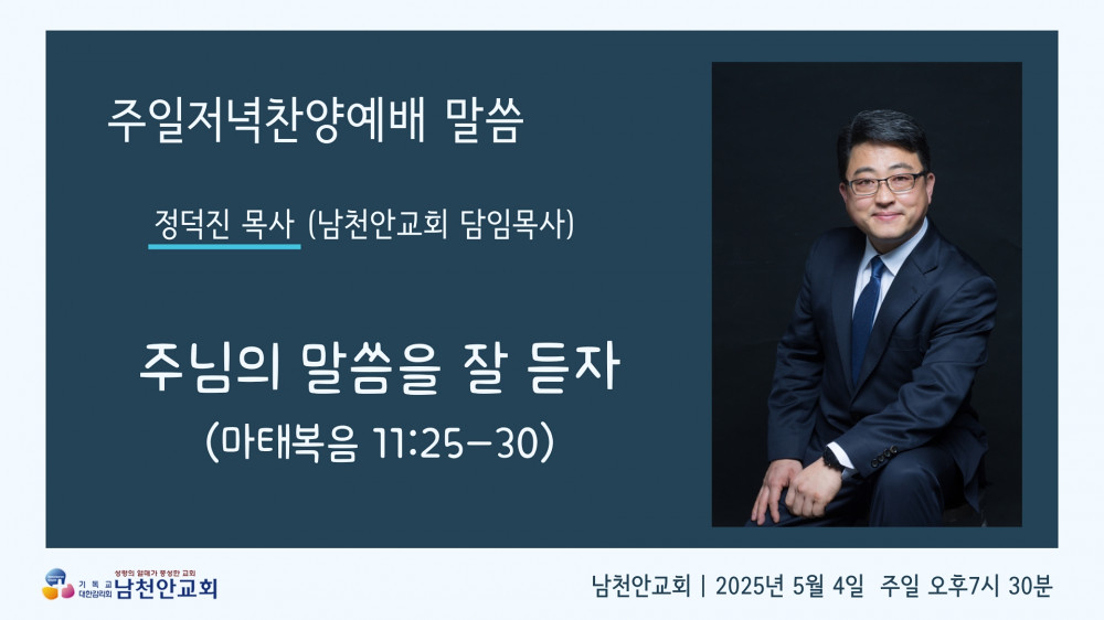 남천안교회_20250504_주일저녁찬양예배_정덕진 목사_마 11:25-30 > 설교말씀