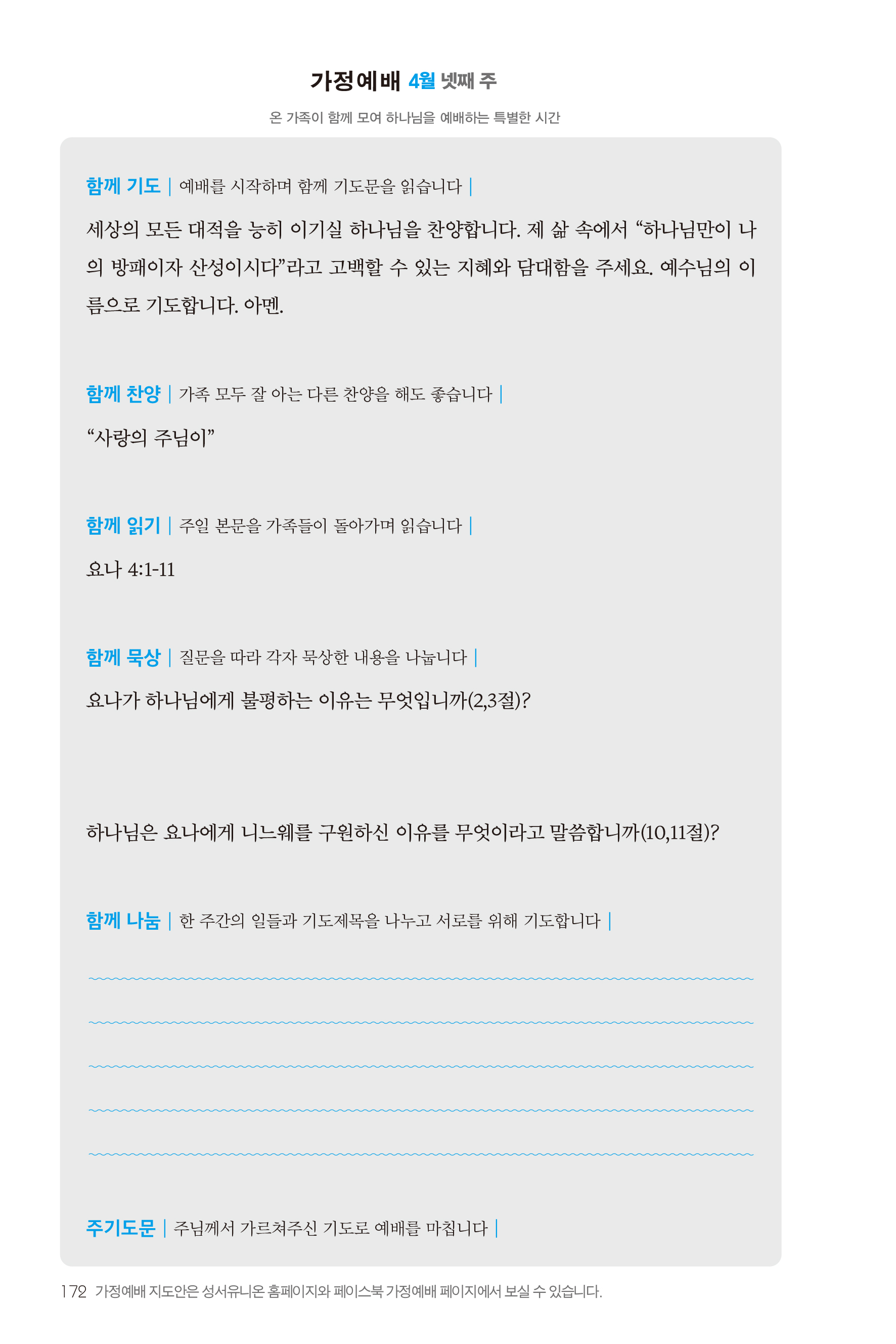 2) 순서지의 내용을 따라 가정예배를 드립니다.