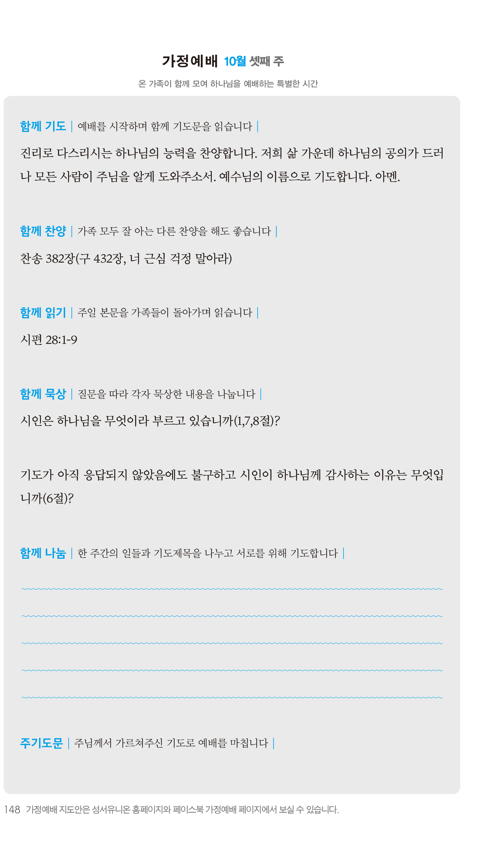 2) 순서지의 내용을 따라 가정예배를 드립니다.