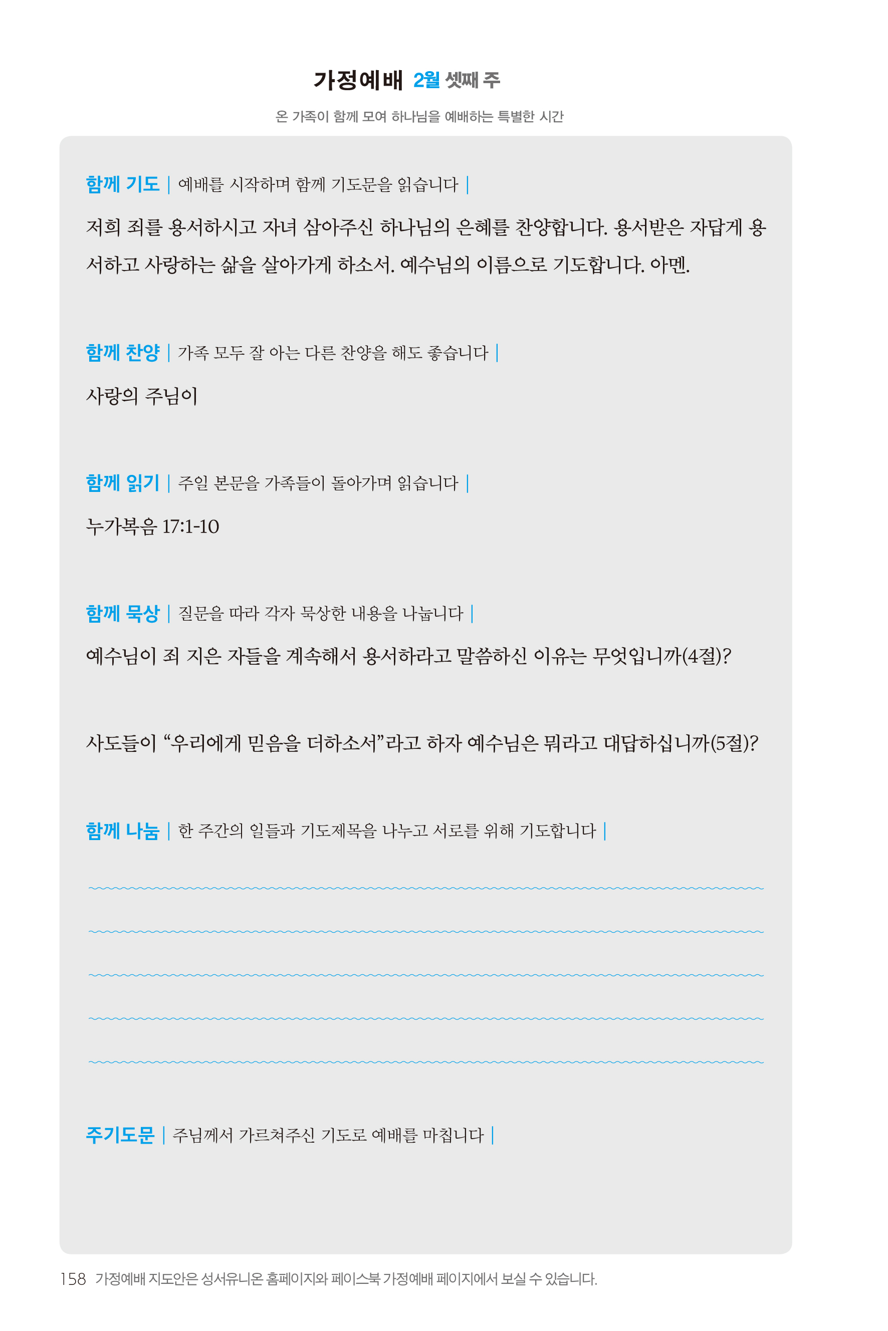 2) 순서지의 내용을 따라 가정예배를 드립니다.