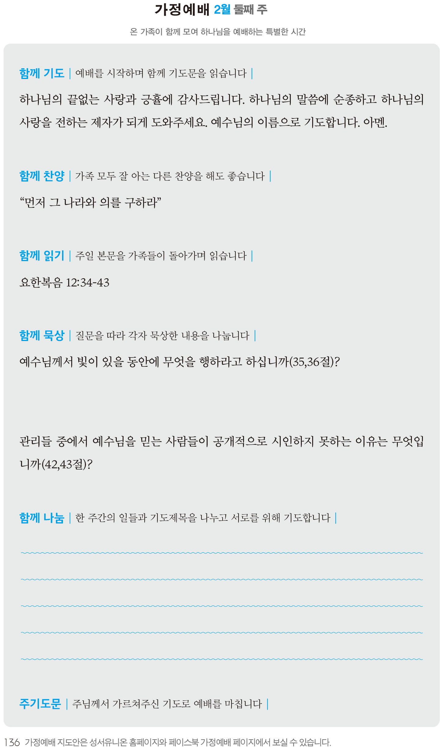 2) 순서지의 내용을 따라 가정예배를 드립니다.