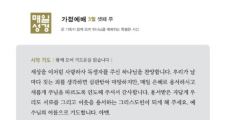 매일성경이용_주일가정예배 (2026년 3월 15일)1) 교회홈페이지에서 매일성경 가정예배지를 다운받아 순서지를 준비합니다.2) 순서지의 내용을 따라 가정예배를 드립니다.3) 함께 묵상할 내용을 서로 질문하고 묵상한 내용을 함께 나눕니다.4) 한 주간의 일들의 기도제목을 나누고 서로를 위해 함께 기도합니다.<매일성경 가정예배 가이드>1. 가정예배는…
