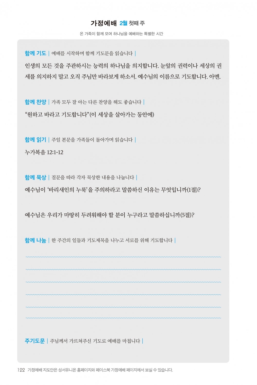 2) 순서지의 내용을 따라 가정예배를 드립니다.