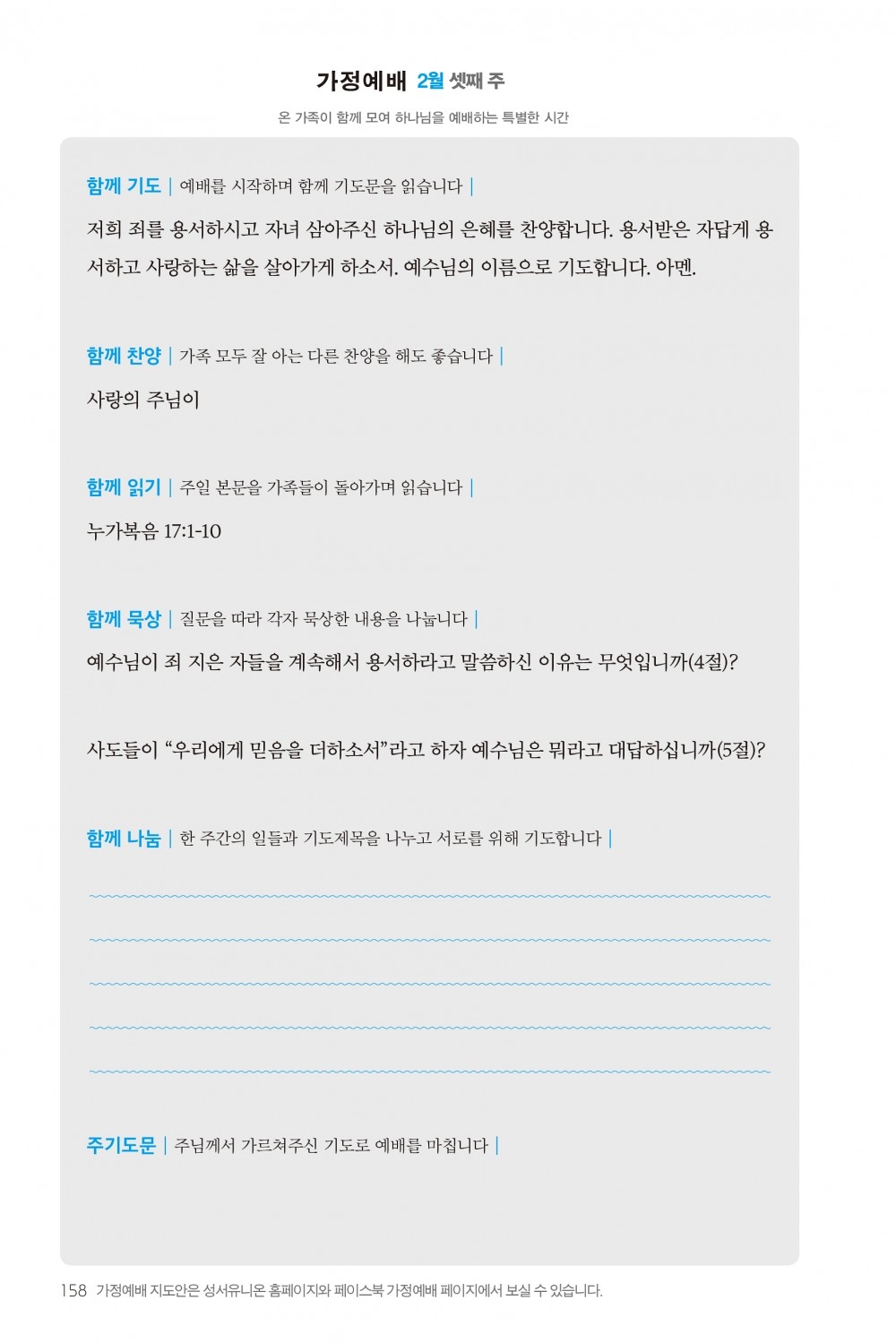 2) 순서지의 내용을 따라 가정예배를 드립니다.