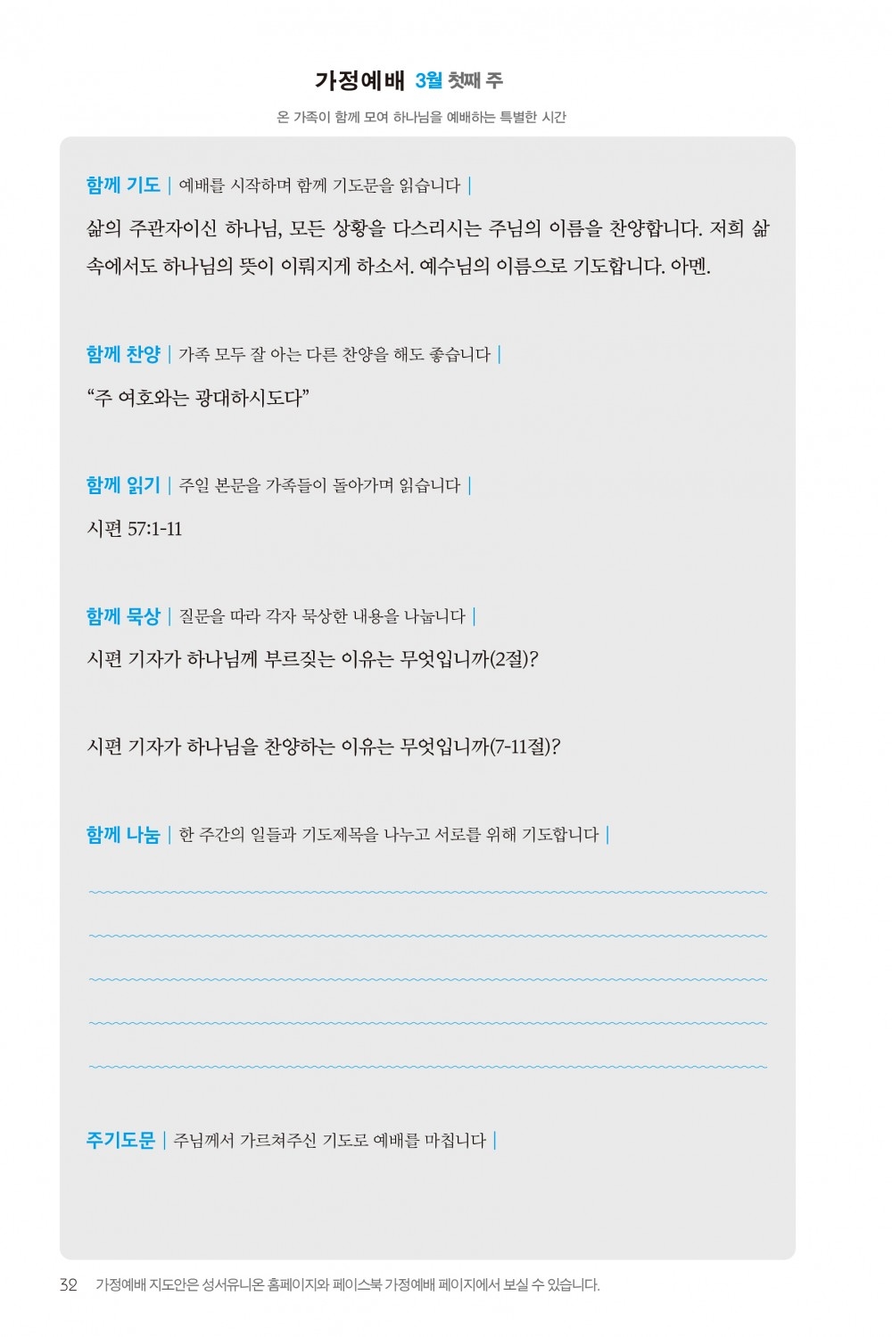 2) 순서지의 내용을 따라 가정예배를 드립니다.
