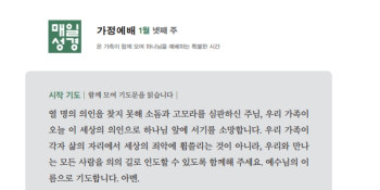 매일성경이용_주일가정예배 (2026년 1월 25일)1) 교회홈페이지에서 매일성경 가정예배지를 다운받아 순서지를 준비합니다.2) 순서지의 내용을 따라 가정예배를 드립니다.3) 함께 묵상할 내용을 서로 질문하고 묵상한 내용을 함께 나눕니다.4) 한 주간의 일들의 기도제목을 나누고 서로를 위해 함께 기도합니다.<매일성경 가정예배 가이드>1. 가정예배는…