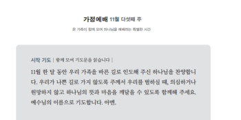 매일성경이용_주일가정예배 (2025년 11월 30일)1) 교회홈페이지에서 매일성경 가정예배지를 다운받아 순서지를 준비합니다.2) 순서지의 내용을 따라 가정예배를 드립니다.3) 함께 묵상할 내용을 서로 질문하고 묵상한 내용을 함께 나눕니다.4) 한 주간의 일들의 기도제목을 나누고 서로를 위해 함께 기도합니다.<매일성경 가정예배 가이드>1. 가정예배…