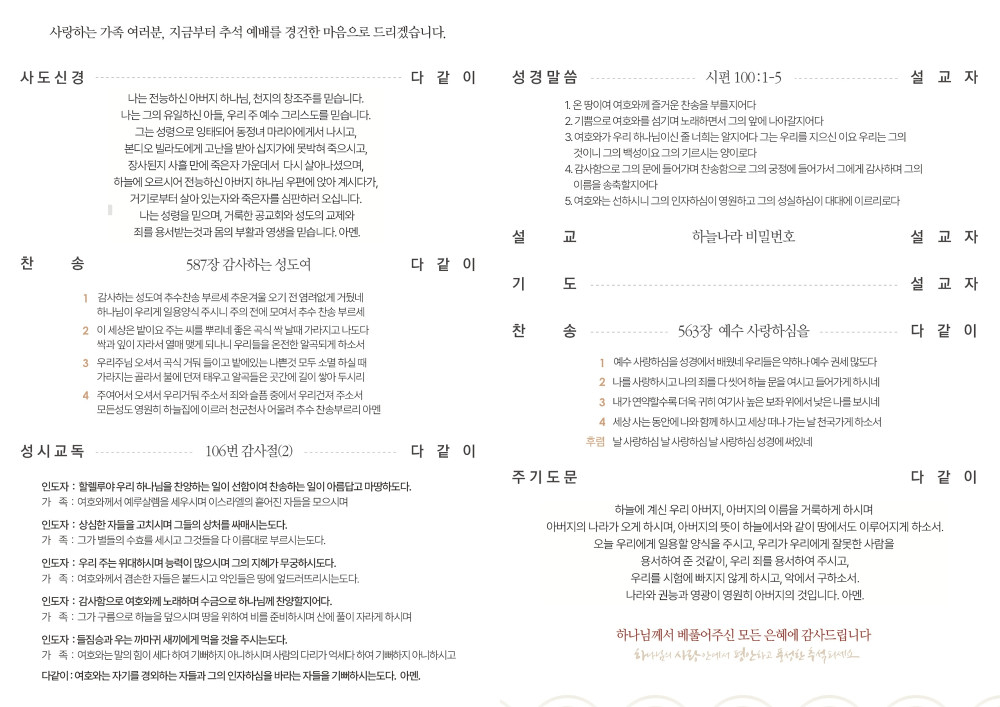 온가족이 함께하는 행복하고 풍성한 한가위 보내세요.아래를 클릭하시면 자료식에서 다운받아 사용하실 수 있습니다. [문서자료] 2025년 추석가정예배 순서지 > 자료실 | 남천안교회 인쇄 주소