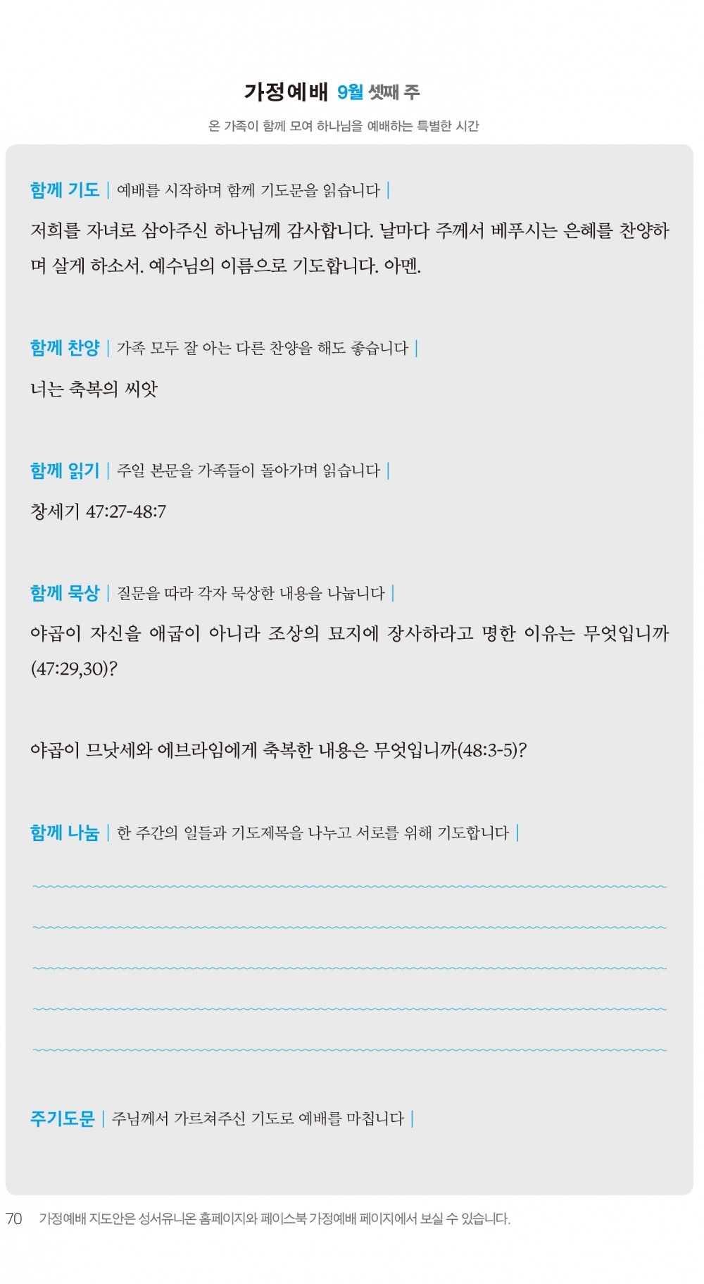 2) 순서지의 내용을 따라 가정예배를 드립니다.