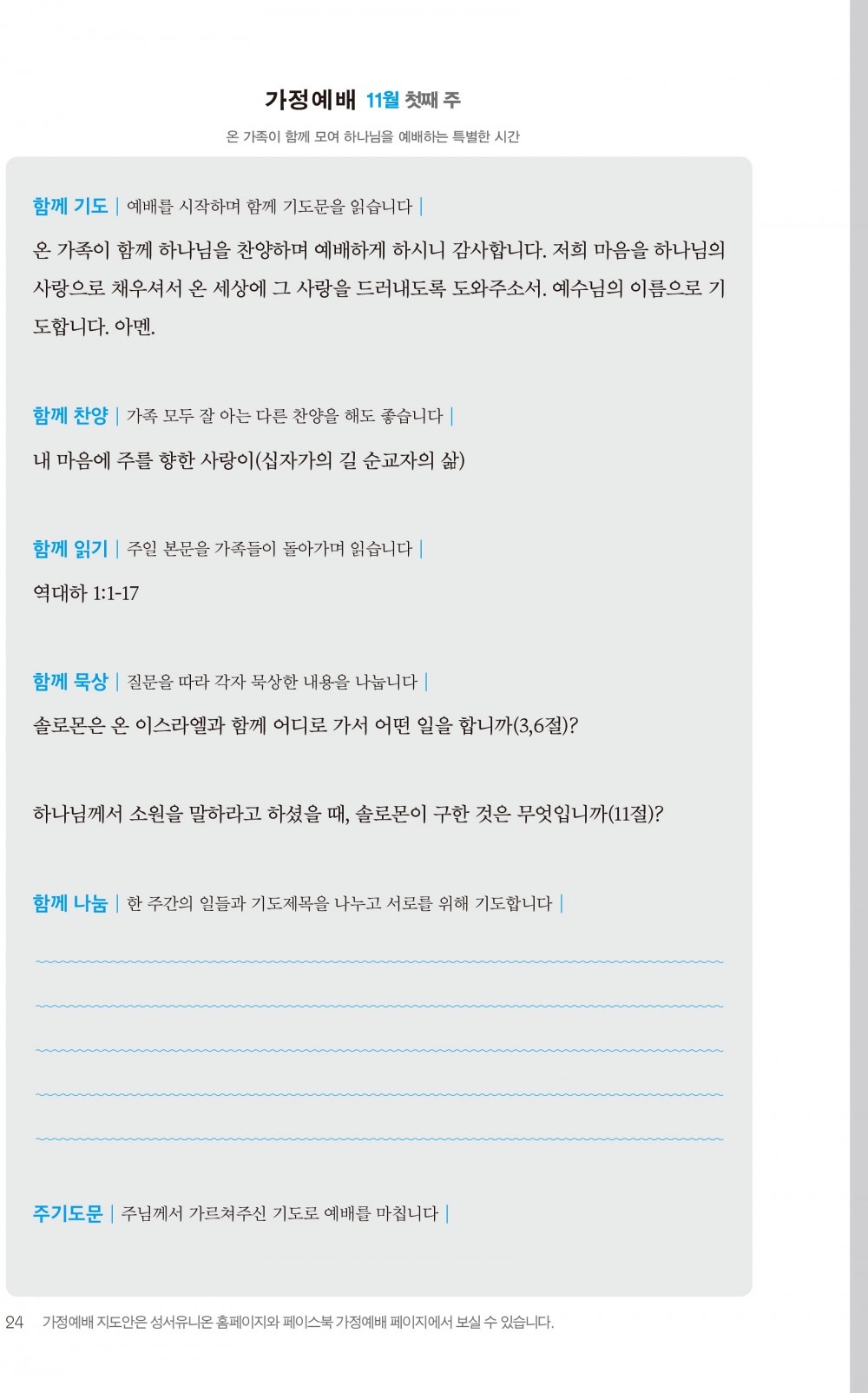 2) 순서지의 내용을 따라 가정예배를 드립니다.