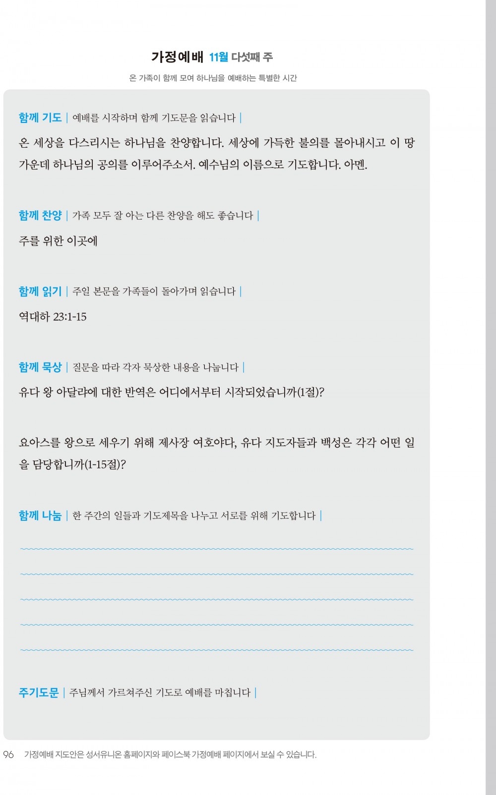 2) 순서지의 내용을 따라 가정예배를 드립니다.