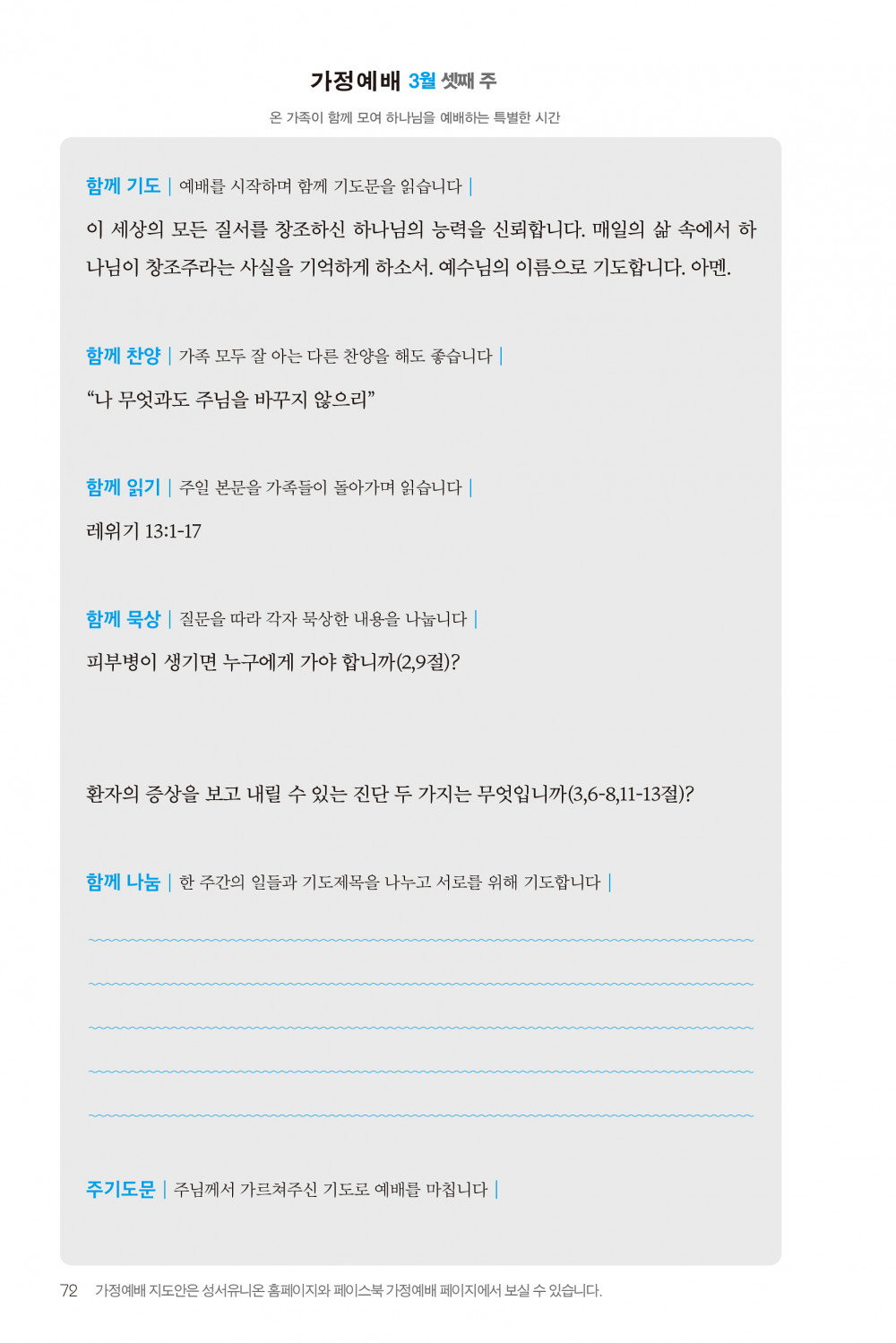 2) 순서지의 내용을 따라 가정예배를 드립니다.